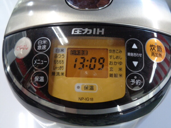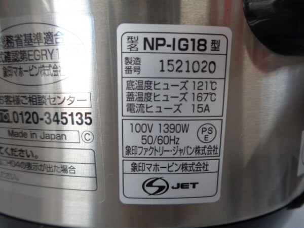 | 商品コメント | ・型式:NP-IG18 ・炊飯容量(白米):1合~1升 (0.18~1.8L) ・電源:100V(50/60HZ) ・炊飯時消費電力:1390W ・保温安定時平均:44W ・外形寸法:幅28×奥行42×高さ25.5 (蓋開時47.5)cm ・本体質量:7.0㎏ ・電源コード:1.5m ・付属品:計量カップX2、しゃもじ ◎未使用品/元箱なし |
