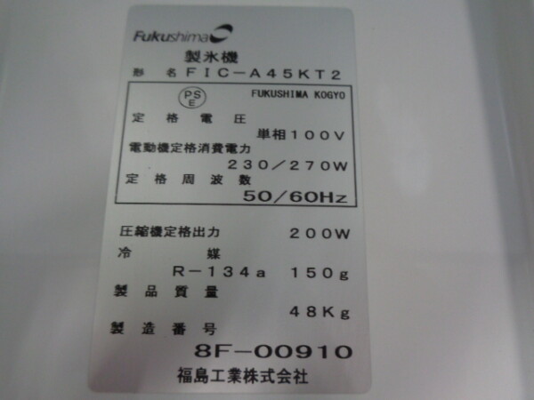 【売約済み】動作確認済み■ フクシマ 45㎏製氷機 キューブアイスメーカー◆FIC-A45KT2◆東京都葛飾区■ic308