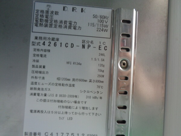 | 商品コメント | ・型式:4261CD-NP-EC「冷蔵庫」 ・電源:100V(50/60HZ) ・サイズ(約):高さ800×幅1200×奥行600mm ・製品質量:70㎏ ・定格内容積:246L ・説明書なし ・取っ手ネジカバー欠品、天板端に腐食箇所あります(画像) ・普通に使用してできる使用感、経年劣化はご了承願います ・出品にあたり正常に稼働することを確認しています ◎動作良好、クリーニング済み |